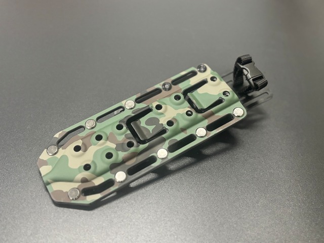刃渡り10cm~16.5cm 厚さ 2mm~6mm 幅 3.3cm以内 の中型ナイフに適合したマルチフィットのナイフシースです。 樹脂製の板バネを一体成型することで、ある程度のテンションを確保しております。 脱落防止にサイドリリースバックルを採用したバンドを取り付けることによって、シーンによった使い分けを可能としました。 また、こちらのナイフシースは上記サイズ内であればトレーニングナイフにもご利用頂けます。 ※当商品はお客様によるシースの組み換え、セットアップを前提として製造されております。 そのためネジロック剤等は使用しておりませんので、お客様にて適宜増し締めをするか、ネジロック剤の使用を推奨します。 ※当商品は分解洗浄が可能です。 ※キリオンが短く(もしくはない)、グリップパネルがない(スケルトンナイフ等)ナイフは刃先がシースを突き抜け、手等怪我をする恐れがあるため使用しないで下さい。 全長 21cm 幅 7cm 重量 100g