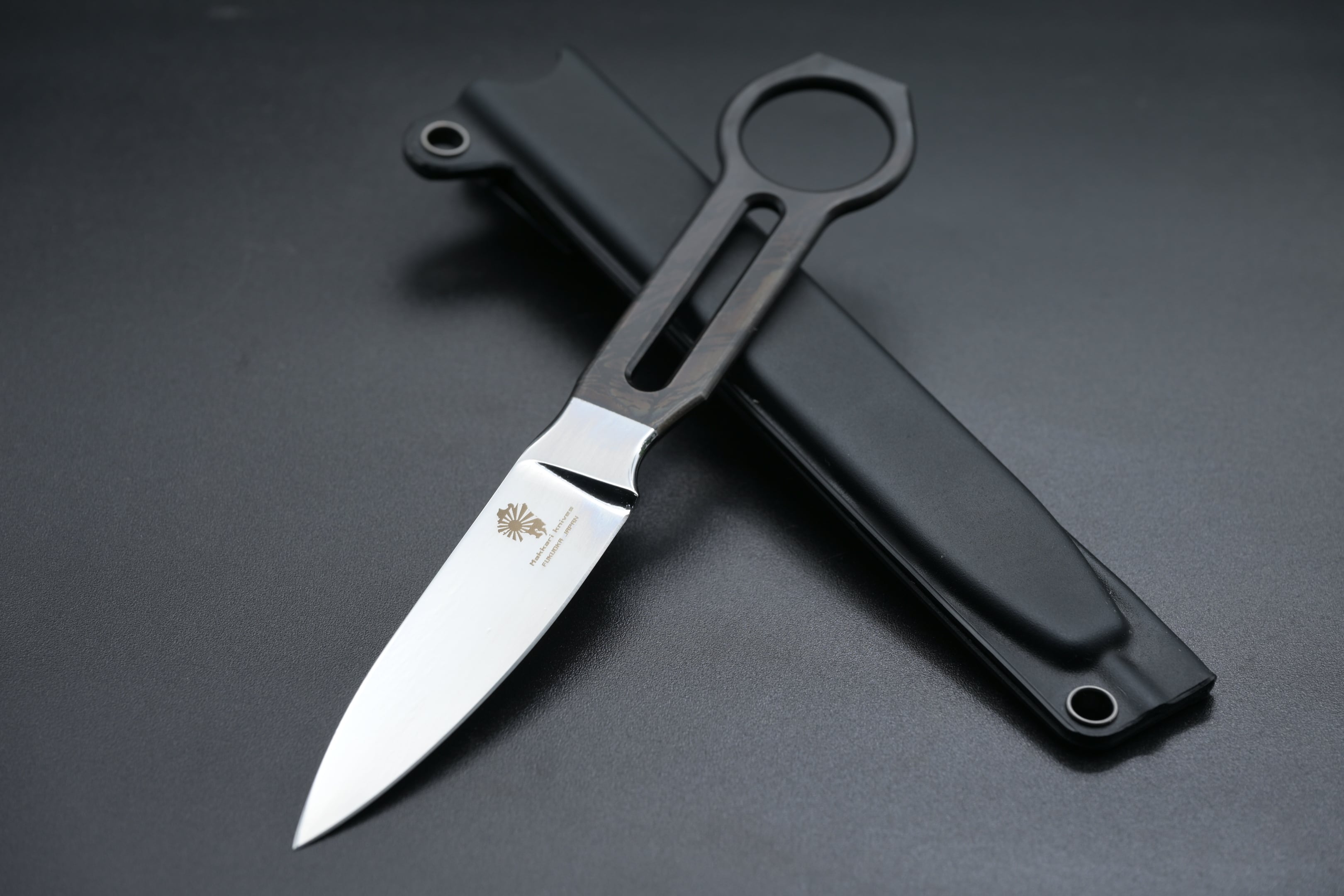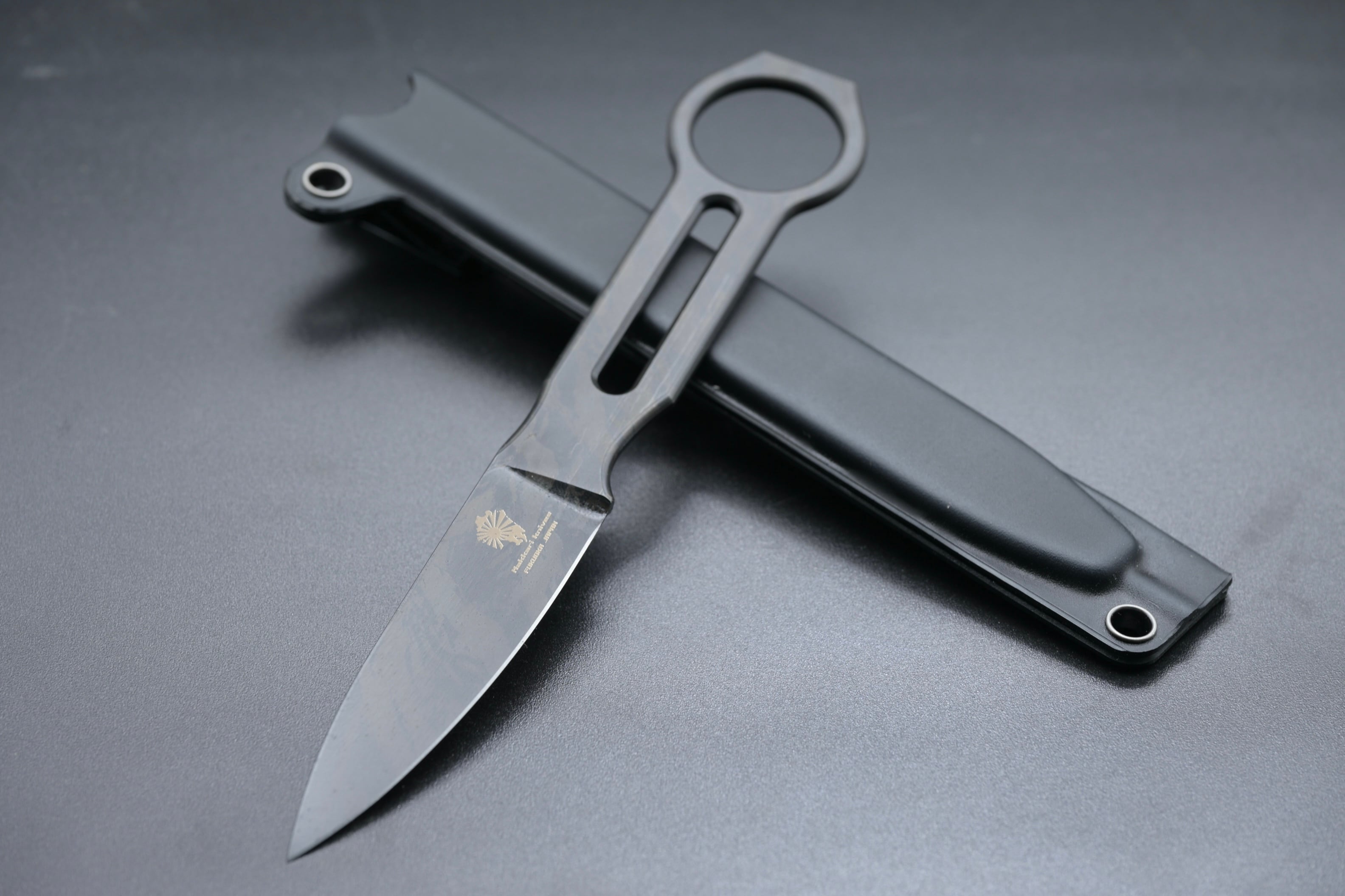 MOLLEウェビングに挿入して携行可能なスケルトンナイフです。細身ですので、鳥撃ちや釣りなどに向いていると思います。ユーティリティナイフとして、扱いやすく作っていますので軽作業などにも向いていると思います。特に、自衛官の方がバックアップやユーティリティ用途に持つのには最適だと思います