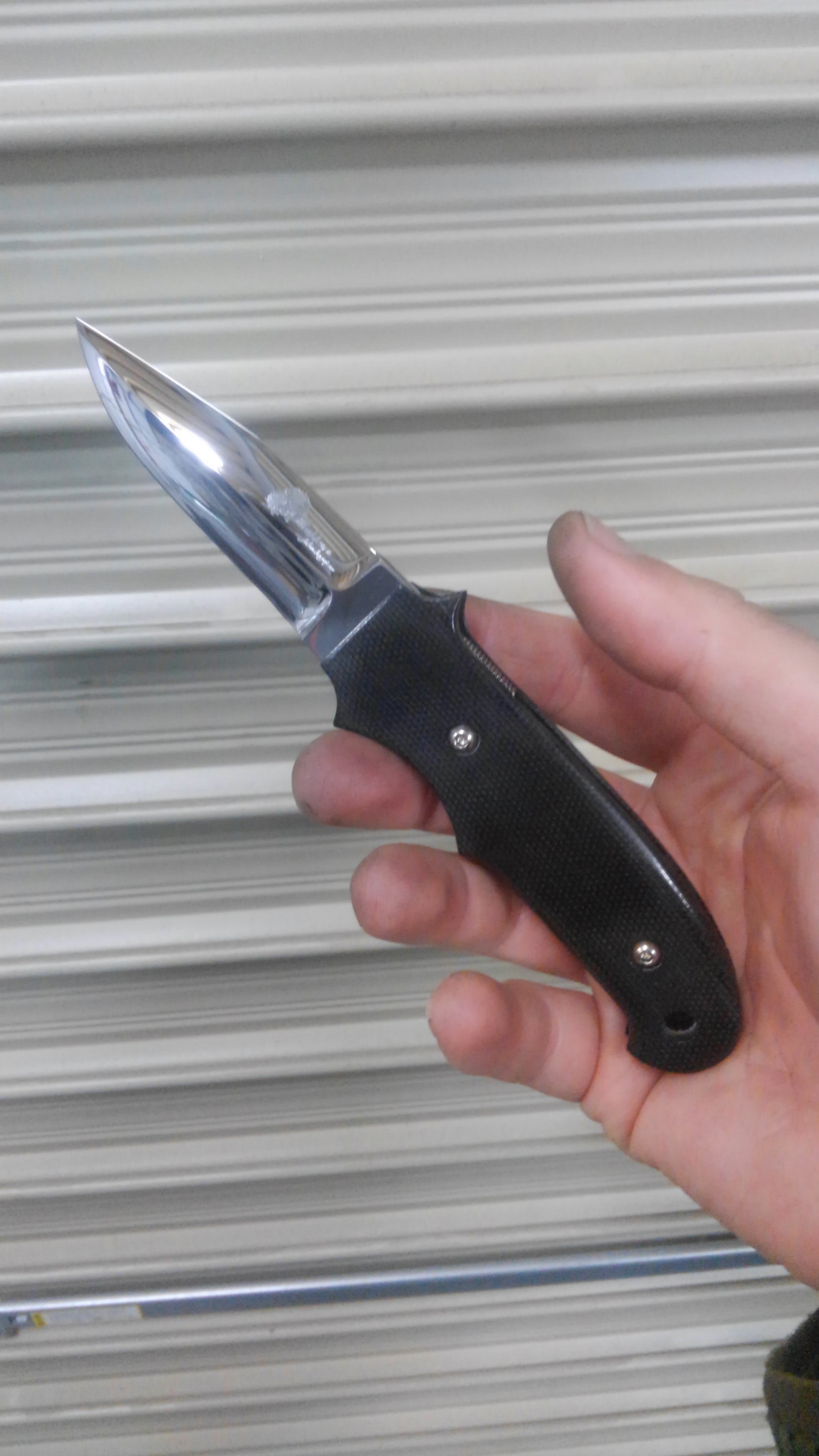 いわゆるフリッパーという物で、ハンドル前方にあるタブを引いてブレードを出すような構造のナイフです。