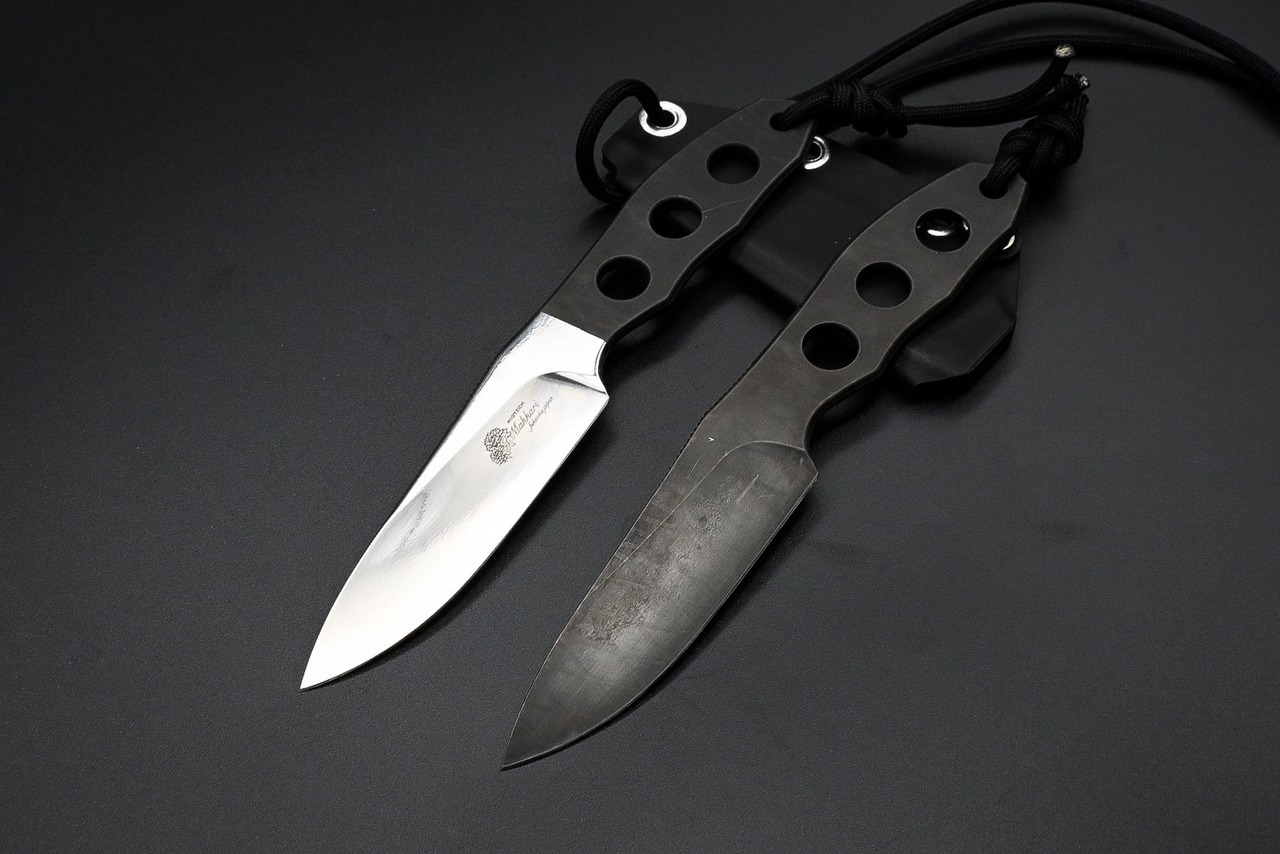 ブレードの処理はミラーフィニッシュと黒染めをご用意しました。キャンプや獲物の解体には水弾きの良いミラーが衛生面でおすすめ、黒ブレードは光の反射が気になる方やダークな見た目が好みの方にオススメです。