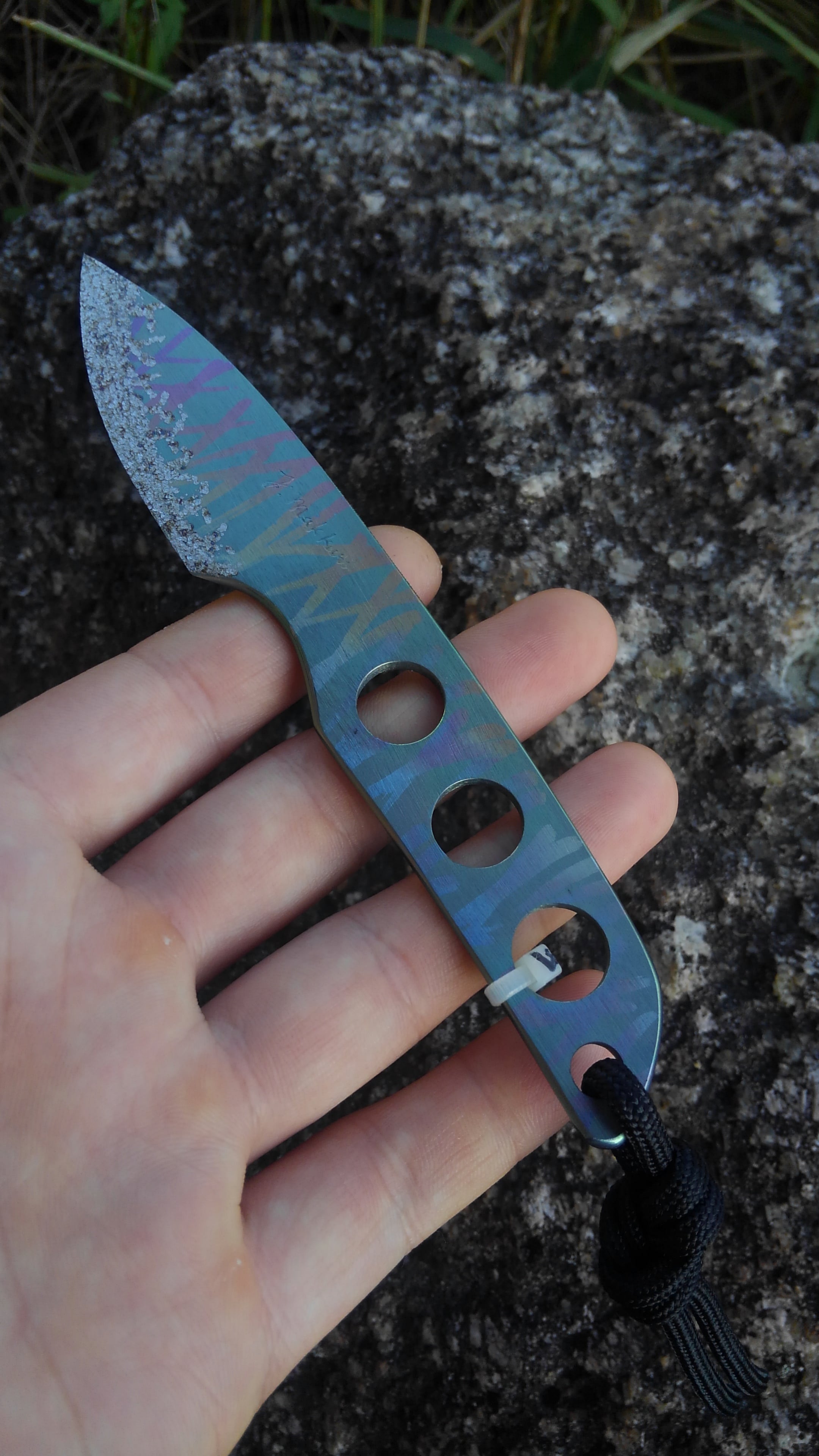また、このナイフは全く錆びません。なので、海での使用には最適です。また、チタンは摩耗に弱いので、砥石で簡単に刃がつきます。鋼材と比較すると1/3くらいの時間かと思います